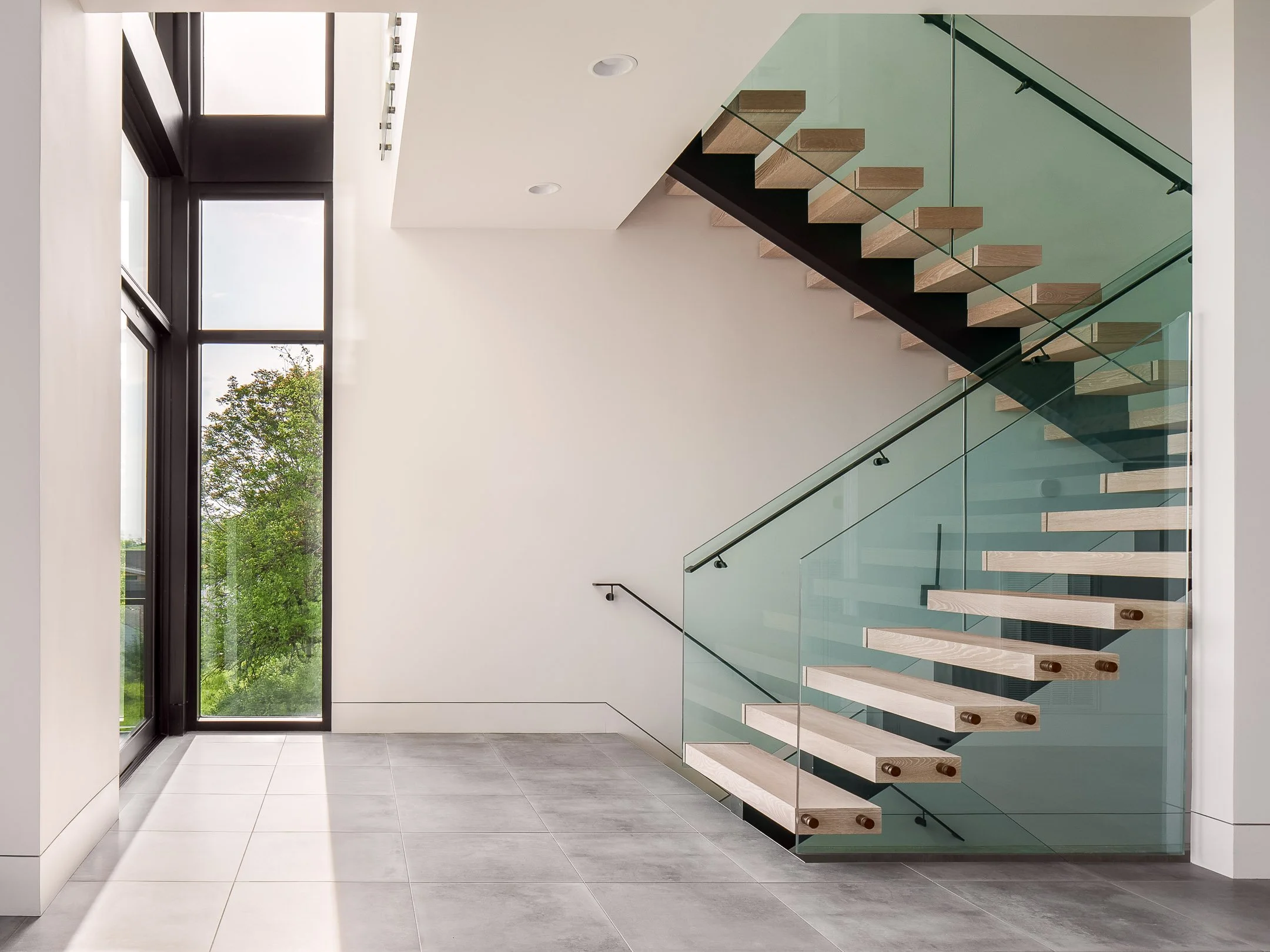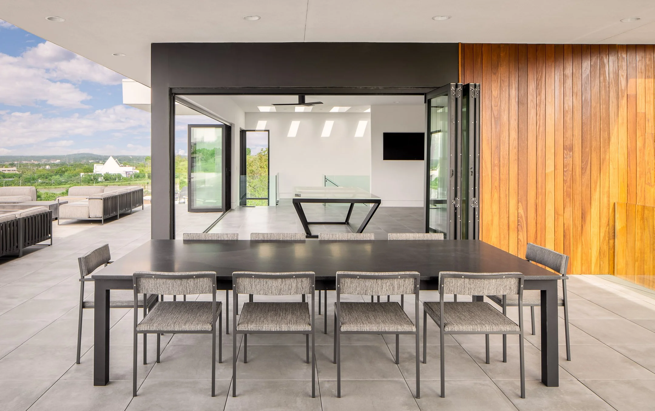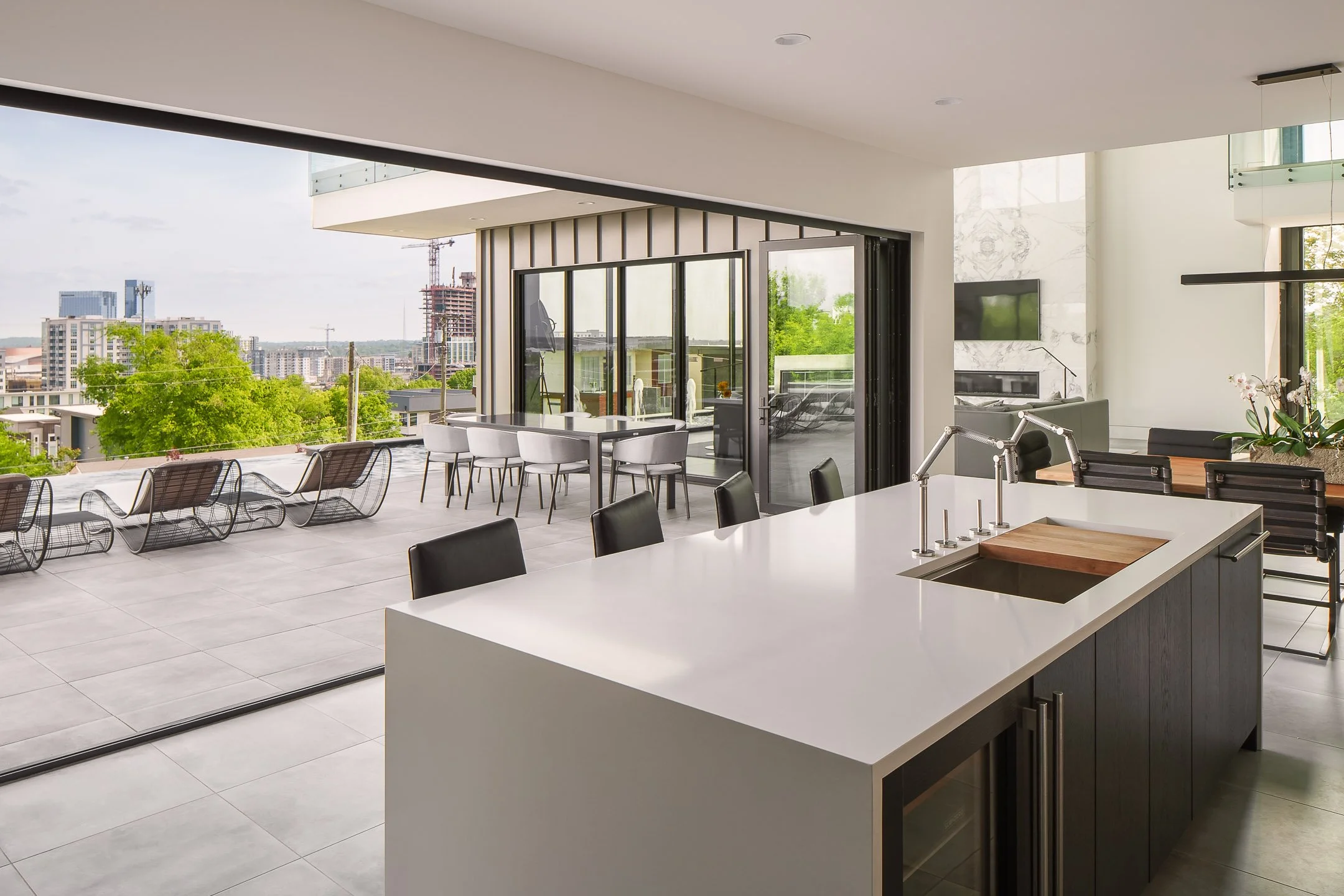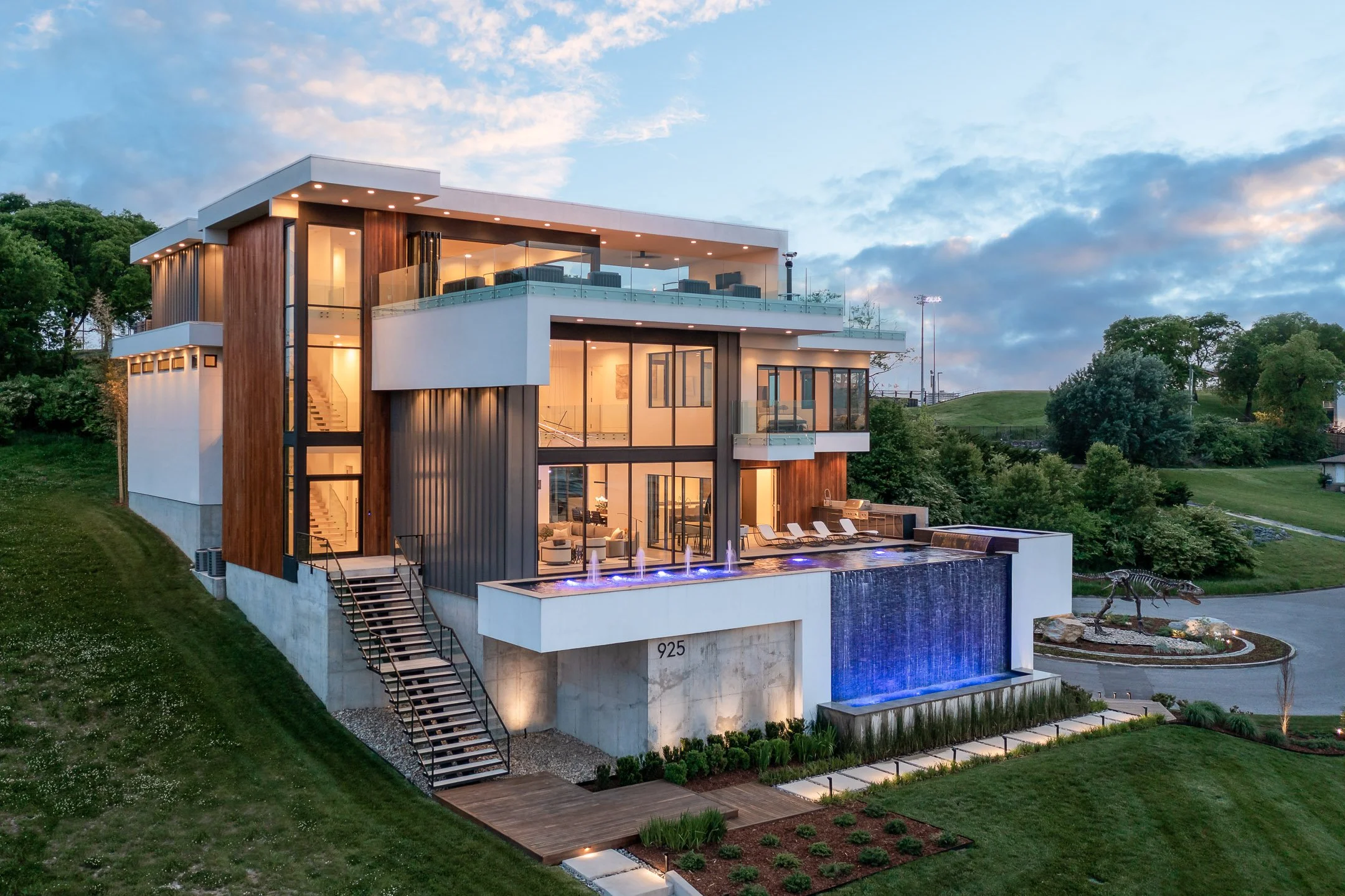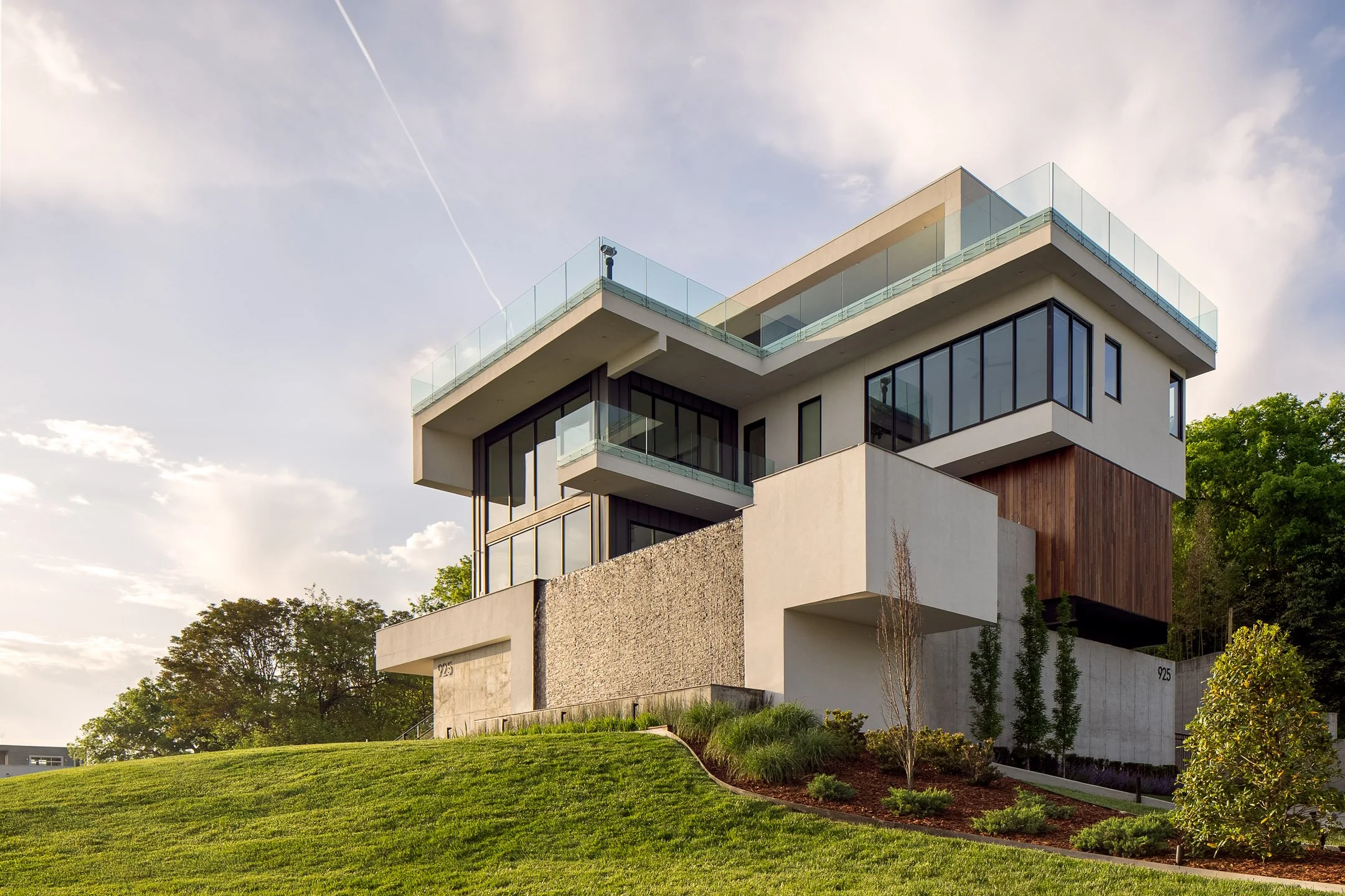 This house if full of unique and impressive features from top to bottom. Dug into the side of a hill overlooking downtown Nashville, the views of the city from each space are unmatched. Starting down low with a parking court leading to a 6 car garage, you climb up to the main living level that already has amazing views of the city skyline overlooking the infinity edge of the suspended pool. The noise of the waterfall cascading down the front of the house provides a peaceful backdrop to the typical city noise. Large walls of glass open up to provide a seamless inside/outside experience while large ceilings in the living room soar and open up to the view. The upper level opens up to a massive deck with views in every direction.